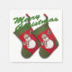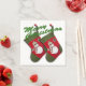 Your personalised napkin design features a duplicate photograph of a red and green stocking with an adorable snowman dressed with a seasonal plaid scarf and hat set over a white background. You can remove the black outlined green Merry Christmas text then click Customise to add text in a font style, colour and size you prefer.Click Customise it! to select a background colour other than white under Edit and Background.