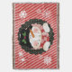 Beautiful Christmas holiday throw features a cute snowman in a black top hat with holly, pink and red striped scarf on red and pink diagonal stripe background with white snowflakes.