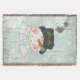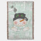Beautiful Christmas holiday throw features a cute snowman in a black top hat with holly, blue and white striped scarf on a soft blue background with white snowflakes.