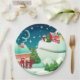 These paper plates are for Christmas time, they have a snowman and a winter scene pictured on them.