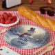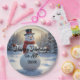 Disposable paper plates with a snowman design and "Happy Holidays" to All greeting. You update the date field at the edit prompt. AI generated art.