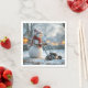A cheerful snowman, wearing a red scarf and hat, pushes a lawnmower through a snowy yard, with softly glowing lights in the background and gentle snowflakes falling.