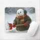 A cheerful, chubby snowman is energetically shoveling a path with a bright red shovel, expertly carving through a deep snowdrift