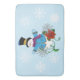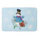 A charming snowman, warmly dressed in a bright blue coat and light blue mittens, arms open wide as if inviting you to share in the joy of the season. Topping off the look is a classic black top hat. Beside the snowman, two large snowflakes and a vibrant red poinsettia that brings a festive pop of colour. All set against a soft light blue backdrop