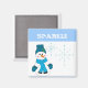 A jolly little snowman dressed in blue accessories with dancing snowflakes around him. A cute carrott nose and little pink heart cheeks.