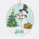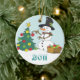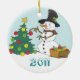 This snowman is getting into the Christmas spirit by trimming the tree. Even the biggest Scrooge's heart will be warmed by it. Image and text on both sides. Customise it with your own text.