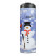 Happy snowman, thermal tumblers for warm drinks, hot Chocolate while playing outside in snow.