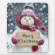 A cheerful snowman, wearing red earmuffs, cap, and a matching scarf, holds a sign that reads "Merry Christmas" amid a snowy background