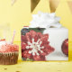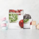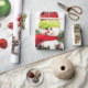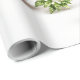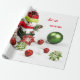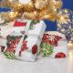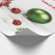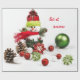 An adorable snowman with festive baubles and pine cones on a white background with "Let it snow" script on holiday wrapping paper.