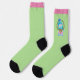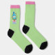 These socks feature an adorable snowman with a Christmas wreath. The snowman is wearing a pink sweater with a soft blue scarf and a matching blue hat.