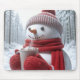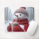 A cheerful snowman dressed in a red hat, scarf, and mittens holds a steaming mug of hot chocolate topped with marshmallows