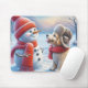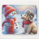 A cheerful snowman and an adorable puppy, both wearing warm winter attire, share a snowy moment under a pastel-coloured sky