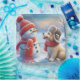 A cheerful snowman and an adorable puppy, both wearing warm winter attire, share a snowy moment under a pastel-coloured sky