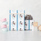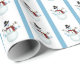 This wrapping paper features jolly snowmen holding snowflake Christmas ornaments. The paper background has a coordinating blue stripe throughout.
