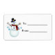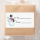 This adhesive gift tag features a jolly snowman holding four snowflake "ornaments".