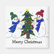 A fun winter scene with two snowmen in hats and scarfs decorating a Christmas tree. Little snowflakes fall in the background. The saying 'merry Christmas' can be changed as desired.