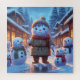 A charming, rosy-cheeked snowman, dressed in warm winter clothes, stands proudly amidst a snowy village. He's surrounded by his creations: three adorable snowmen of varying sizes. The warm glow from the village houses illuminates the scene, creating a cosy and festive atmosphere.