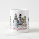Christmas Tree decorated by three SnowPals on a winters day along a snow drift with a red script Merry Christmas greeting, a great gift to others or express a Merry Christmas to others with this fun winter design.