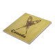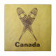 A crossed pair of snowshoes on a braintan leather background. Customisable text reading "Canada" also appears. There are several different styles of traditional snowshoes. Those pictured here are made of Ash and moosehide babiche (webbing) in the Alaskan pattern. Longer and thinner than some other styles, such as the bearpaw, Alaskan snowshoes allow for a more natural gate and are well suited for cross-country travel. The slightly upturned tips allow you to drag your feet a bit. Be advised snowshoes can make for excellent skies; generally at the worst possible moment.