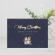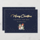 Custom blue and gold Merry Christmas card featuring two snowmen against a blue background decorated with a snow vignette. A faux gold foil script holiday greeting adds a more festive look to this holiday card. Easily personalise this blue holiday card with your family name and text or customise it to create a beautiful business holiday card. The gold foil effect is only simulated in the artwork. More colour options available.
