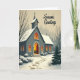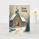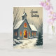 This card shows a calm winter scene with a snow-covered church at the centre. The grey church stands out against the snowy landscape, with bare trees creating a peaceful backdrop. Warm light glows from the doorway in soft orange and gold tones.