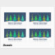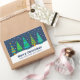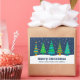 A modern geometric design of five fir trees in teal, turquoise and golden yellow. The sky is navy blue with white falling snow. The text says "Merry Christmas" with a section for a custom name or family.