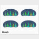 A modern geometric design of five fir trees in teal, turquoise and golden yellow. The sky is navy with white falling snow.
