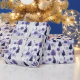 Purple Christmas wrapping paper roll featuring whimsical trees in a snowy Christmas themed forest.
