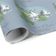 This scenic custom wrapping paper features a winter mountain landscape on a dusty blue background. Beautiful, snowy rocky mountains are pictured in the distance, with a forest of pine trees featured in the foreground. A flock of birds is flying away in the distance.