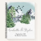 This scenic custom notebook features a winter mountain landscape. Beautiful, snowy rocky mountains are pictured in the distance, with a forest of pine trees featured in the foreground. A flock of birds is flying away in the distance.