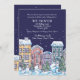 A charming winter-scene featuring snow-covered homes on a snowy night. Suitable as a moving announcement, Christmas party, Open House and more.
