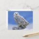 Animal card showing a snowy owl sitting on a rock. The snowy owl (Bubo scandiacus) is a large owl of the typical owl family Strigidae. This yellow-eyed, black-beaked white bird is easily recognisable. It is one of the largest species of owl and, in North America, is on average the heaviest owl species. The adult male is virtually pure white, but females and young birds have some dark scalloping; the young are heavily barred, and dark spotting may even predominate. Its thick plumage, heavily feathered taloned feet, and colouration render the snowy owl well-adapted for life north of the Arctic Circle.