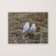 Original photo of a pair of snowy owls sitting on a driftwood log by the beach surrounded by dried grass and flowers.