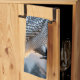 A beautiful snowy owl is perched on a tree branch, while snow falls lightly around her, and a full moon is suspended in the background.  Beautiful Christmas kitchen towel, perfect for anyone who loves owls, birds, nature, and the outdoors.
