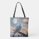 A beautiful snowy owl is perched on a tree branch, while snow falls lightly around her, and a full moon is suspended in the background. Beautiful tote bag, perfect for anyone who loves owls, birds, nature, and the outdoors.