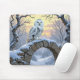 A majestic snowy owl sits peacefully on a snow-covered stone arch, surrounded by a tranquil winter landscape of bare trees beneath a pastel-hued sky