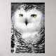 This beautiful poster print features a close up photograph of the stunning snowy owl. A young female white owl, she has a round head with white face, black beak and beautiful yellow eyes. The plumage of females and young snowy owls is more distinctive than that of the male of the species with black horizontal bars or speckles. Male snowy owls can be almost pure white.