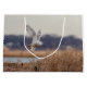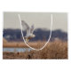 Snowy owl taking off large gift bag