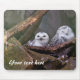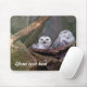 Two snowy owls sitting among trees and stones. Add your own text by replacing "Your text here".