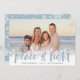 Modern Hanukkah photo cards feature your favourite image with a white snowflake border along the bottom. "Peace and light" appears in light blue hand lettered brush typography, with your names and the year beneath.