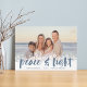 Modern Hanukkah photo cards feature your favourite image with a white snowflake border along the bottom. "Peace and light" appears in slate blue hand lettered brush typography, with your names and the year beneath.