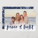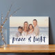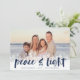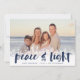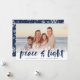 Modern Hanukkah photo cards feature your favourite image with a white snowflake border along the bottom. "Peace and light" appears in navy blue hand lettered brush typography, with your names and the year beneath.