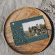 A modern and elegant Christmas holiday card design featuring a horizontal photo on a forest green background adorned with pine trees laden with snow and topped with white stars. Personalise with your custom holiday greeting, family name and the year.