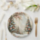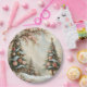 Snowy Scene with Christmas Trees and Pink Roses Paper Plate