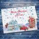 Send a bit of Kentucky to your friends and family this Holiday Season, with this cute watercolor design of a whimsical snowy mountain village. Included in the image are colourful houses, a snowman, and a red pickup truck with a Christmas tree in the back. Icy blue snowflakes fall down from the sky. The text in red at the top can be changed to anything you'd like, as can the text on the inside. *Image design credit to EphrazyDesign.