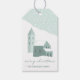 A cosy holiday gift tag with cute hygge vibes, featuring a snowy Christmas village scene. "Merry Christmas" appears beneath in handwritten script lettering. Personalise with your family name or names.