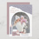 A cosy holiday card design with cute hygge vibes, featuring your favourite vertical or portrait-orientated photo in an arch layout, set amidst a snowy Christmas village scene. "All is calm, all is bright" appears in retro lettering. Personalise with your custom holiday greeting, family name, and the year.