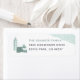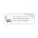 A cosy holiday return address label design with cute hygge vibes, featuring a snowy Christmas village scene. Personalise with your family name and address.