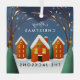 Original illustration of a snowy hillside village, matching holiday photo card. Transfer to another ornament style to add a photo on the back. This glass ornament is single sided and translucent.