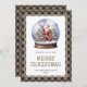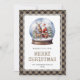 Custom buffalo plaid Christmas card featuring a snow globe with Santa Claus and reindeer. Easily personalise this watercolor Christmas card with your family name and the year.